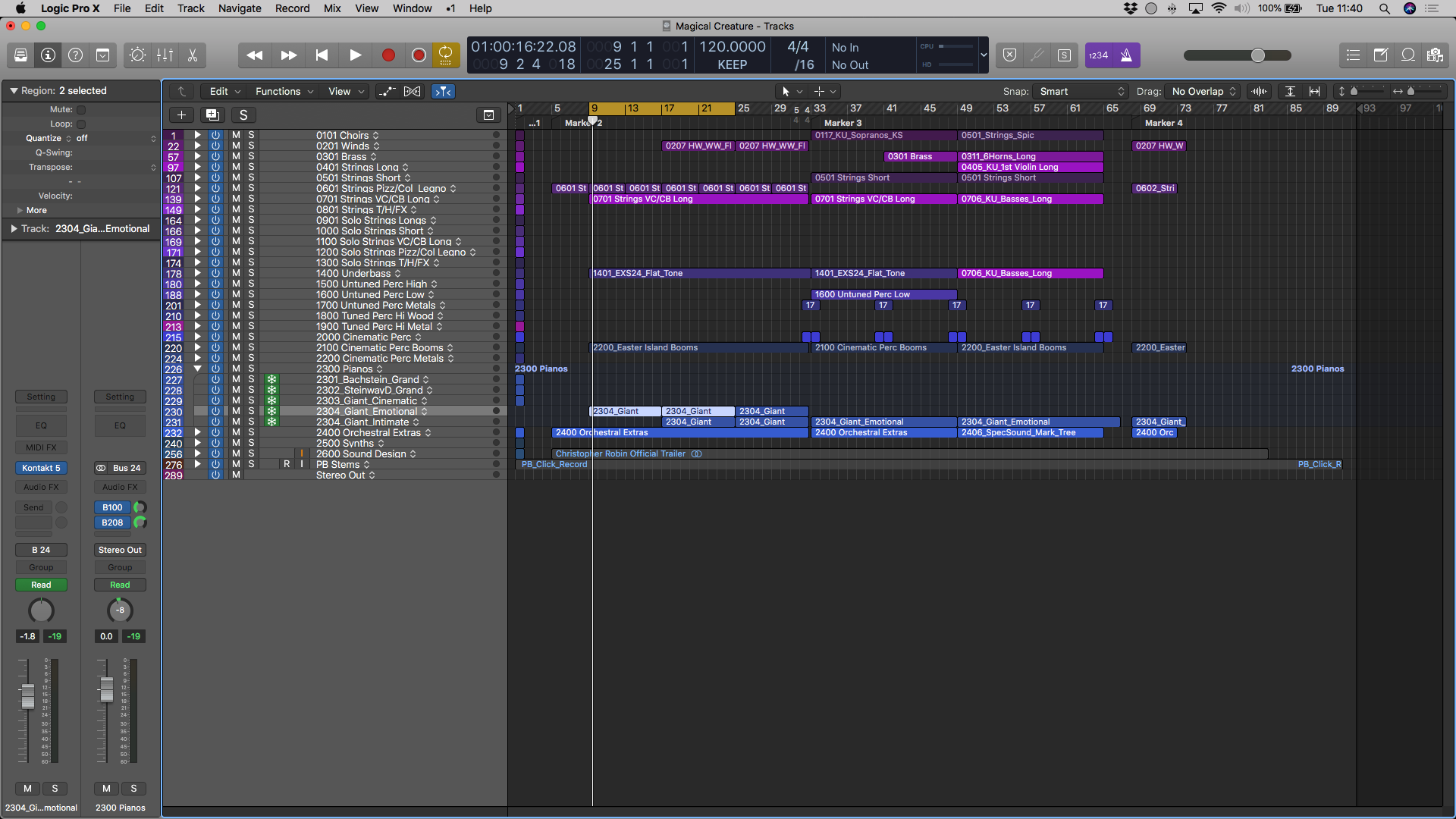 First thing I do, save a copy of the arrangement/the composition and rename it to Magic Creature Mix. That way I leave the original work safe and don’t touch it, compositionally. Then I get that project open and spend some time tediously getting rid of all of the tracks I didn’t use.